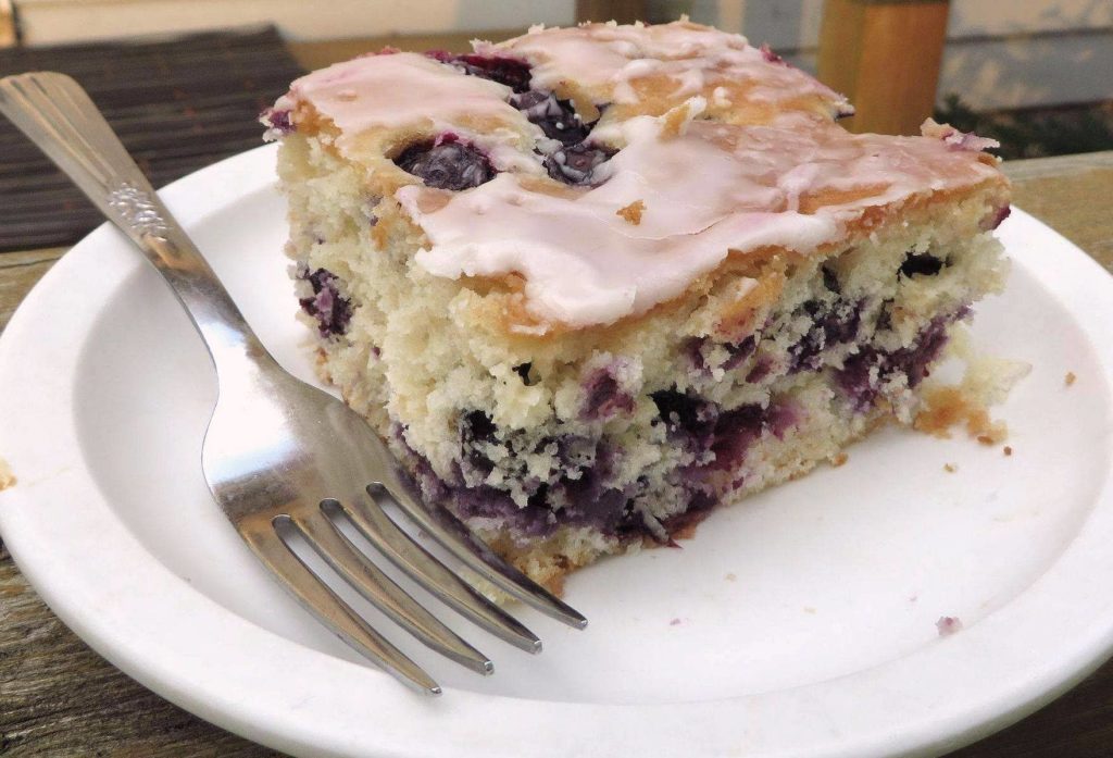 When cake is done, drizzle the glaze over the whole panful while it is still warm