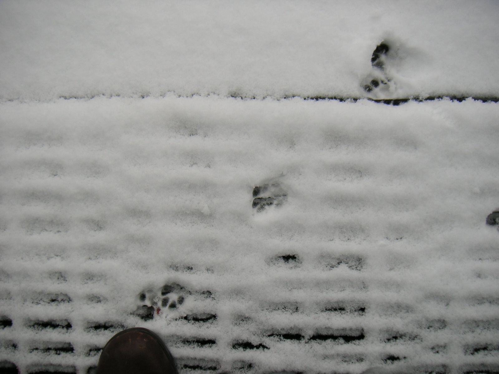 Oscar’s paw prints in the snow. He only made it 3″ from the mat